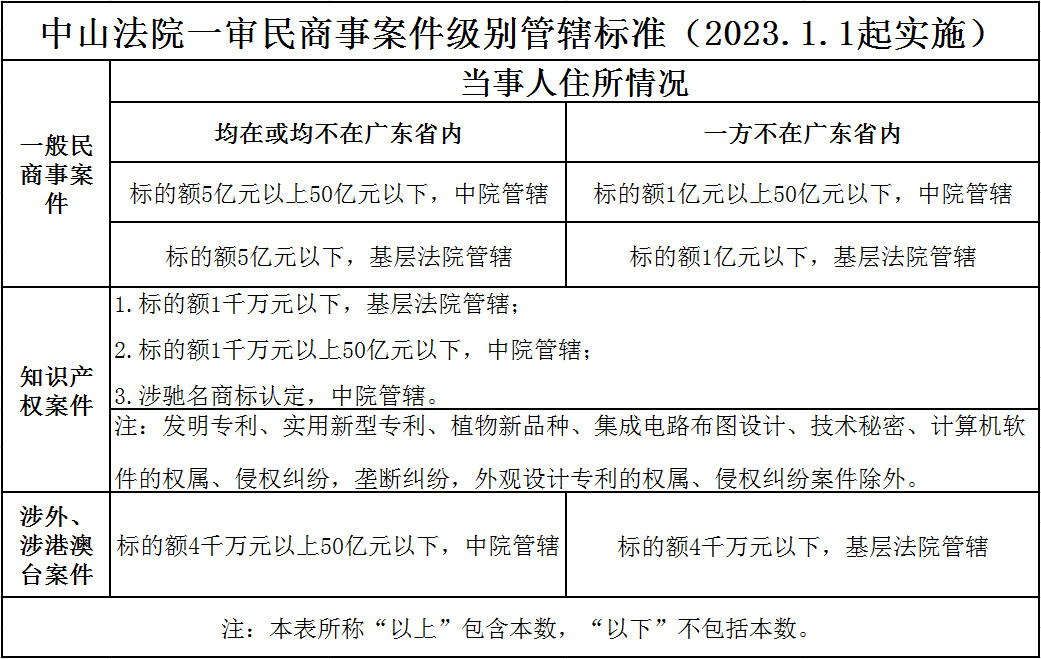 中山法院一審民商事案件級(jí)別管轄標(biāo)準(zhǔn)(2023.1.1起實(shí)施)