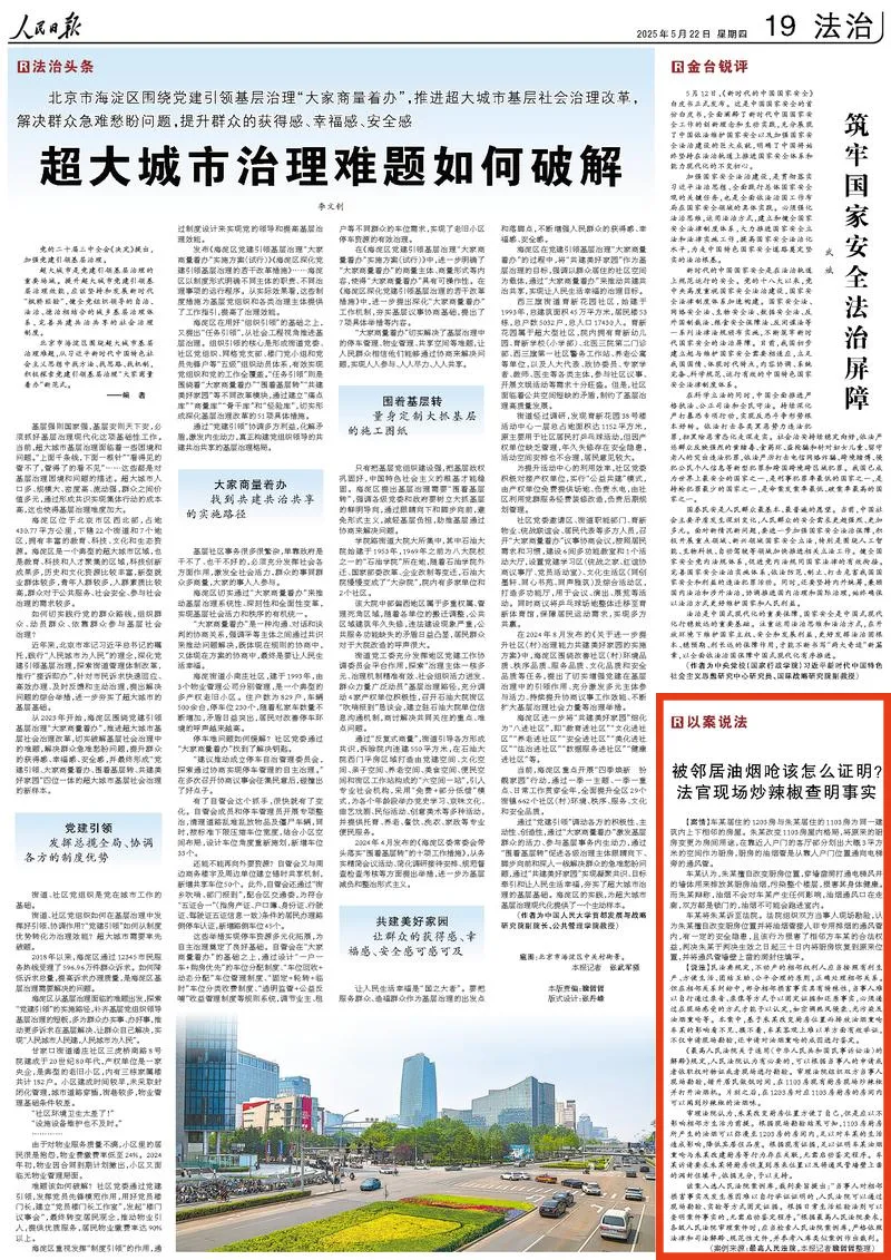 編者按 民法典頒布五年來,1260個(gè)條文在千萬起司法案件中轉(zhuǎn)化為公平正義的生動(dòng)實(shí)踐,更通過潛移默化的普法教育形塑著全社會(huì)的價(jià)值理念與規(guī)則意識(shí)。五周年之際,最高人民法院官微開設(shè)“‘典’亮美好生活”專欄,最新一期推出人民日?qǐng)?bào)昨日刊發(fā)的廣州中院審理案件《被鄰居油煙嗆該怎么證明?法官現(xiàn)場(chǎng)炒辣椒查明事實(shí)》。