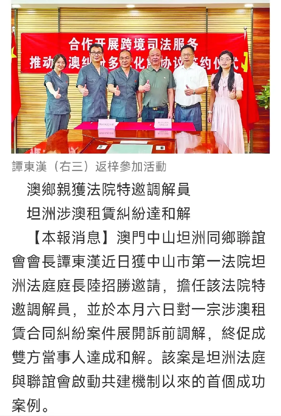 近日,《澳門日報》刊登了一篇報道,“澳鄉(xiāng)親獲法院特邀調(diào)解員,坦洲涉澳租賃糾紛達(dá)和解”。