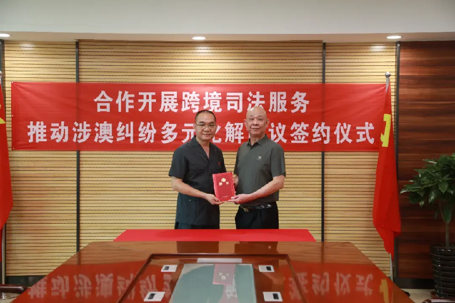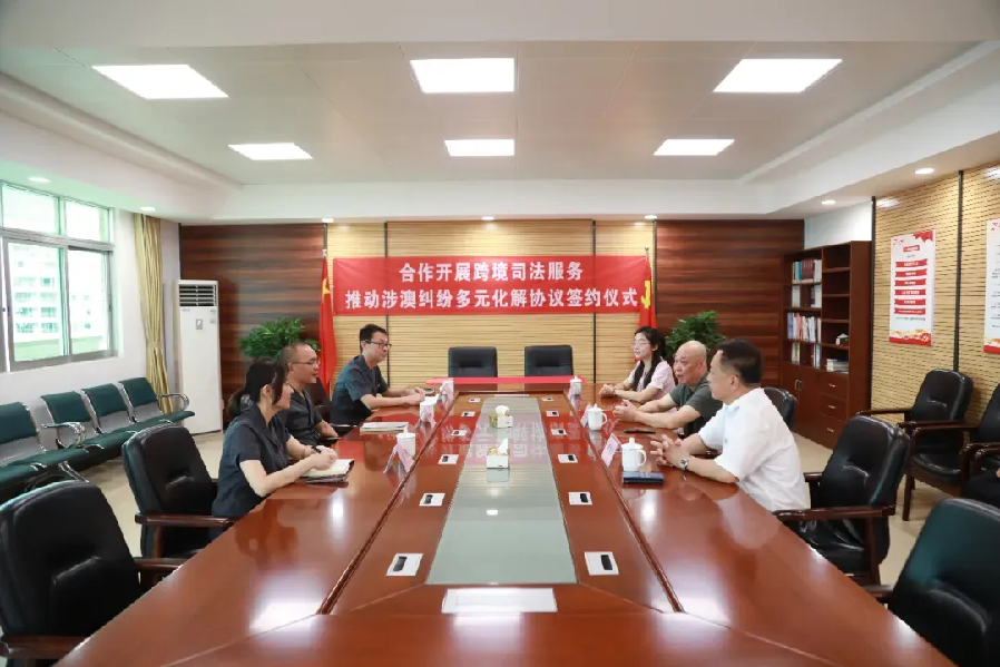 ▲合作協(xié)議簽約儀式 5月30日,市第一法院坦洲法庭、澳門同鄉(xiāng)會、坦洲鎮(zhèn)僑聯(lián)召開合作共建工作會議。會上,坦洲法庭與澳門同鄉(xiāng)會共同簽訂了《以高質(zhì)量司法服務(wù)推動涉澳糾紛多元化解的協(xié)議》,明確“坦澳相融”機(jī)制的工作宗旨為:“深化聯(lián)動,協(xié)同互助,同鄉(xiāng)社團(tuán)充分發(fā)揮地緣、人脈優(yōu)勢,在人民法庭訴訟程序、解紛等方面提供協(xié)助支持。法庭利用專業(yè)優(yōu)勢為社團(tuán)成員提供更加便捷、優(yōu)質(zhì)的司法服務(wù),實現(xiàn)效能疊加和良性互動。加強(qiáng)澳門居民對內(nèi)地司法的認(rèn)同感,尋求最優(yōu)化解涉澳當(dāng)事人的矛盾糾紛路徑,最大化保護(hù)涉澳糾紛當(dāng)事人的合法權(quán)益,助推粵港澳大灣區(qū)涉外法治建設(shè)高質(zhì)量發(fā)展?!?/span>