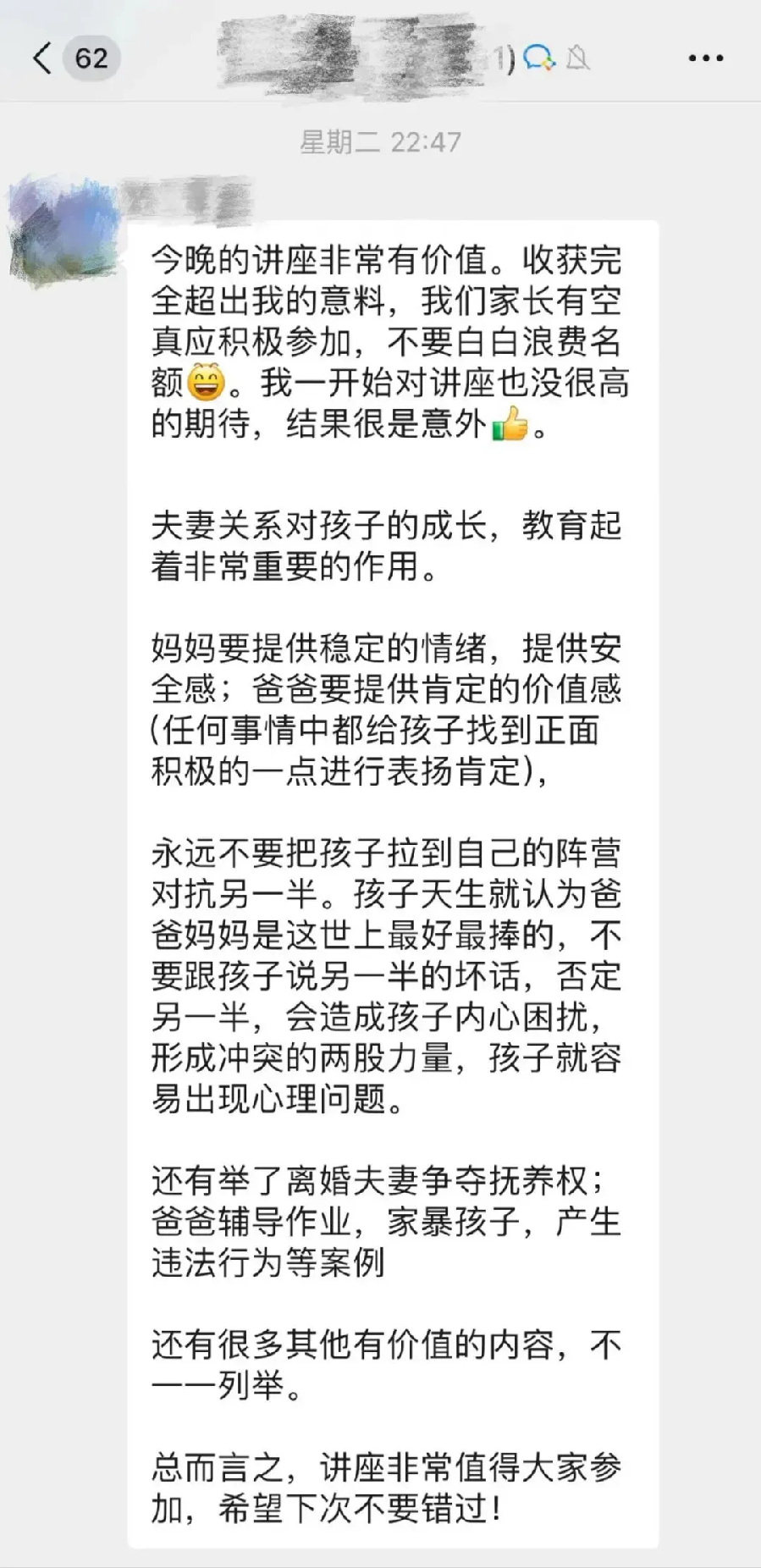 為更好地助力家長(zhǎng)習(xí)得與孩子進(jìn)行高效溝通的技巧,活動(dòng)還邀請(qǐng)心理咨詢師朱洪岐,以“讓愛(ài)流動(dòng)”為主題,從“母親、父親對(duì)孩子成長(zhǎng)的意義、夫妻關(guān)系如何影響孩子身心健康”等方面引導(dǎo)家長(zhǎng)們掌握科學(xué)的家庭教育方法,為家長(zhǎng)們?cè)诩彝ソ逃杏龅降睦Ь程峁┲敢?/span>