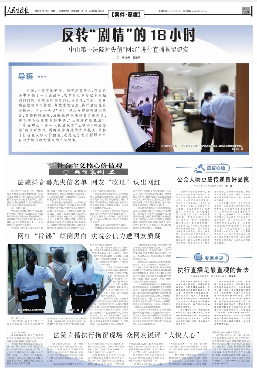 11月11日,《人民法院報(bào)》第三版以“反轉(zhuǎn)‘劇情’的十八小時(shí)”為題,整版深入報(bào)道了市第一法院以“互聯(lián)網(wǎng)+司法辦案”的創(chuàng)新方式對(duì)失信“網(wǎng)紅”進(jìn)行直播拘留,成功執(zhí)結(jié)一起合同糾紛案件,收獲廣大網(wǎng)友點(diǎn)贊的經(jīng)典案例。