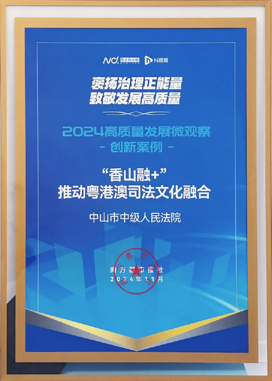 11月29日,由南方報業(yè)傳媒集團指導(dǎo),南方都市報社、N視頻主辦的“褒揚治理正能量,致敬發(fā)展高質(zhì)量”2024高質(zhì)量發(fā)展微觀察優(yōu)秀案例展示會在廣州白云國際會議中心隆重舉行。會議發(fā)布了《2024高質(zhì)量發(fā)展微觀察調(diào)研報告》,來自全國政界、學(xué)界、商界的上百名代表參會,現(xiàn)場對珠三角各城的高質(zhì)量發(fā)展微觀察優(yōu)秀案例進行集中展示、表彰。其中,中山市中級人民法院打造的“香山融+”粵港澳司法文化融合項目入選“2024高質(zhì)量發(fā)展微觀察”9大創(chuàng)新案例。