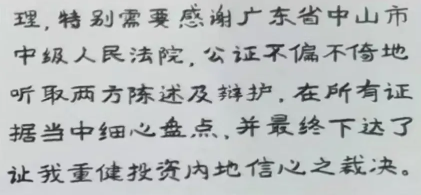 “這案件就是我人生當(dāng)中的一個(gè)小插曲,我們每個(gè)人劃著一葉小舟行駛在時(shí)間的江河里,有時(shí)陽(yáng)光明媚,有時(shí)風(fēng)雨交加,期間的點(diǎn)點(diǎn)滴滴,組成了我們五味雜陳的過(guò)去,令我思緒萬(wàn)千?!迸伺扛锌溃案兄x法院,公正不偏不倚地聽(tīng)取兩方陳述及辯護(hù),在所有證據(jù)當(dāng)中細(xì)心盤點(diǎn),并最終下達(dá)了令我重健投資內(nèi)地信心的裁決!”
