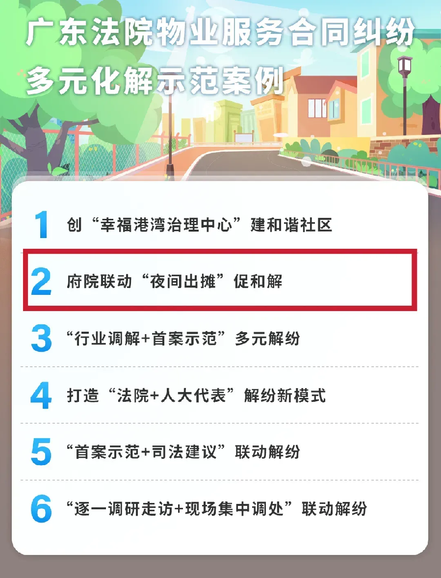 此次一共發(fā)布6個案例,中山市第一人民法院坦洲法庭的《府院聯(lián)動“夜間出攤”促和解》案例入選其中。在這個案件中,法院啟動“法庭+綜治+城建”工作機制,多方聯(lián)合開展物業(yè)糾紛治理專項行動,共同派出27名工作人員前往小區(qū)“擺攤設點”,傾聽業(yè)主意見,釋法答疑,大部分業(yè)主交納了物業(yè)費,物業(yè)公司也撤回了起訴,取得良好效果。
