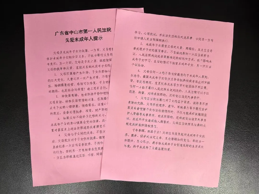 “現(xiàn)在向你們發(fā)放《關(guān)愛(ài)未成年人提示卡》,請(qǐng)你們?cè)陔x婚后繼續(xù)履行對(duì)孩子的撫養(yǎng)、教育和保護(hù)義務(wù),共同為孩子創(chuàng)造一個(gè)穩(wěn)定、和諧的成長(zhǎng)環(huán)境?!?/p> 近日,中山市第一人民法院在審理一起涉未成年子女的離婚案件時(shí),向當(dāng)事人發(fā)出《關(guān)愛(ài)未成年人提示》(以下簡(jiǎn)稱《提示》),督導(dǎo)雙方當(dāng)好合格家長(zhǎng),避免離婚糾紛對(duì)未成年人產(chǎn)生不利影響。 這是自4月15日最高人民法院發(fā)布《關(guān)于在涉及未成年子女的離婚案件中開(kāi)展“關(guān)愛(ài)未成年人提示”工作的意見(jiàn)》后,中山發(fā)出的首份《提示》,對(duì)促進(jìn)未成年人身心健康具有重要意義。