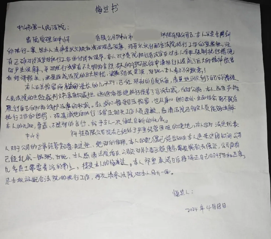 由于廠里還有數(shù)名員工,考慮到直接拘留會引起仍在工作的員工焦躁恐慌,執(zhí)行干警并沒有采取現(xiàn)場拘留的措施,而是要求劉某到法院進一步說明情況。 來到法院后,執(zhí)行法官耐心對劉某釋法說理,但劉某仍然沒有一點和談的誠意,堅持聲稱自己沒有還款能力,甚至質(zhì)疑法院的文書。在多次勸說無果后,為震懾拒不履行義務的被執(zhí)行人,高麗法官果斷決定對其采取司法拘留措施。 法警為劉某戴上手銬并通知其家屬后,劉某開始慌了,表示愿意籌錢還款。同時接到通知的劉某家屬也開始籌錢,并在送拘后的3個小時內(nèi),劉某家屬向申請人還清全部欠款。 “我已意識到自己的錯誤,司法權威不可挑戰(zhàn),我會全力配合法院工作……”劉某在看守所內(nèi)寫下了悔過書。