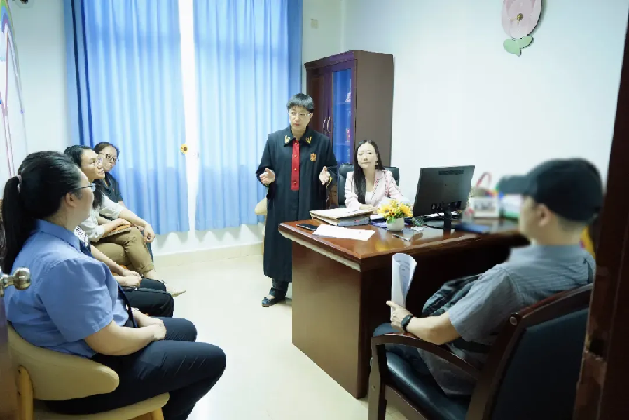 “親子修復(fù)是一個(gè)長期的工作,你認(rèn)為的修復(fù)好可能只是表象,要常常陪伴為孩子提供安全感,重新學(xué)會(huì)做爸爸?!毙睦碜稍儙熢谛∶鞲改鸽p方的交談中敏銳的找到了問題和癥結(jié),運(yùn)用專業(yè)知識(shí)從孩子成長的角度、夫妻雙方角色分配等角度進(jìn)行了客觀分析,逐漸紓解了雙方當(dāng)事人心中長期郁結(jié)的負(fù)面情緒,增進(jìn)了相互的理解。“離婚不是一件失敗的事,但因?yàn)殡x婚導(dǎo)致對(duì)孩子的傷害才是失敗的事,家庭暴力不僅是違法行為,更是導(dǎo)致家庭關(guān)系惡劣的根源,和諧親子關(guān)系是有效實(shí)施家庭教育的前提,不要讓孩子用一生去療愈不幸的童年?!秉S燕芳法官則將晦澀難懂的法律知識(shí)“掰開揉碎”一點(diǎn)點(diǎn)向阿成進(jìn)行細(xì)致講解,并告知其家庭是溫暖的港灣,是講愛、講關(guān)懷的地方,在子女教育方面要投入更多的耐心和溫情,文明開展家庭教育,當(dāng)好合格家長。 為孩子守護(hù)成長的晴空“一下午的心理疏導(dǎo)和家庭教育指導(dǎo)工作能換來一家人帶著笑容離開法庭,真好?。 笨粗⒊梢患宜目谝黄痣x開的背影,大家紛紛感嘆道。在承辦法官、檢察官、婦聯(lián)干部和心理咨詢師的合力配合下,小明父母從剛開始的兩方水火不容,到現(xiàn)在氣氛緩和,這套“組合拳”終見成效,小明父母已打開心結(jié),雖已離婚,但為孩子健康成長,也愿放下恩怨,相互配合,做好孩子的家庭教育。
