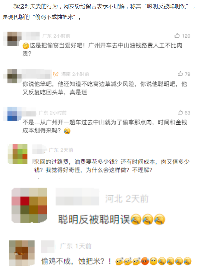 被抓后,林某和吳某如實交代了整個作案過程。原來,為了不被發(fā)現(xiàn),兩人每次偷盜價值約500元的商品。一個月內(nèi),他們以“大包換小包”的方式作案7次,共計盜得價值約3500元人民幣的商品,用于日常生活食用。事后,兩人為取得超市的諒解,賠償了10000元。但即便如此,他們的行為也無法逃脫法律的制裁,法院經(jīng)依法審理,判決林某和吳某犯盜竊罪,其中林某被判處有期徒刑八個月,并處罰金人民幣3000元;吳某被判處有期徒刑六個月,緩刑一年,并處罰金人民幣3000元。 法院介紹,盜竊罪是典型的數(shù)額型犯罪,需要達到一定金額才入刑,但在多次盜竊的情形下,即使每次金額未達到數(shù)額較大標準,行為人多次盜竊,同樣構成盜竊罪。 法官提醒,誠信社會有賴大家共建,在生活中,像林某和吳某這樣的盜竊行為,有違“法治”“誠信”的社會主義核心價值觀。他們看似只是貪圖小便宜,但實際上后果嚴重,一旦構成犯罪,將受到法律的懲治。 網(wǎng)友:我不理解 就這對夫妻的行為,網(wǎng)友紛紛留言表示不理解,稱其“聰明反被聰明誤”,是現(xiàn)代版的“偷雞不成蝕把米”。