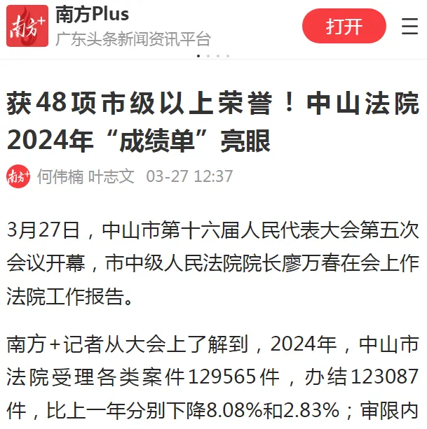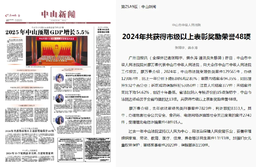 《南方日報》 2024年,中山市法院受理各類案件129565件,辦結(jié)123087件,比上一年分別下降8.08%和2.83%;審限內(nèi)結(jié)案率94.35%,同比提升9.92個百分點;訴前成功調(diào)解糾紛53050件,同比增長36.91%;未結(jié)案件同比下降54.62%,創(chuàng)近十年最低。市中級法院受理案件13894件,辦結(jié)13096件。審判執(zhí)行質(zhì)效持續(xù)向好,全市法院共獲得市級以上表彰榮譽48項。