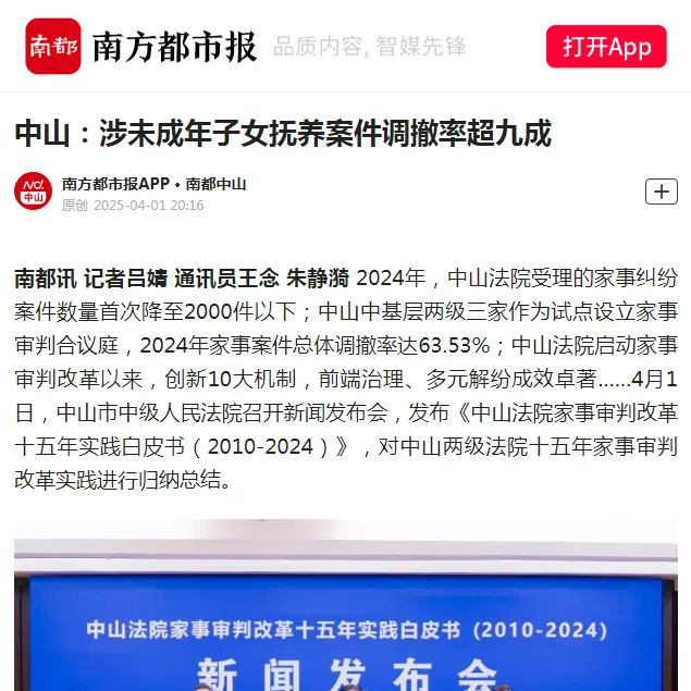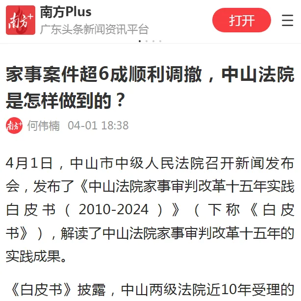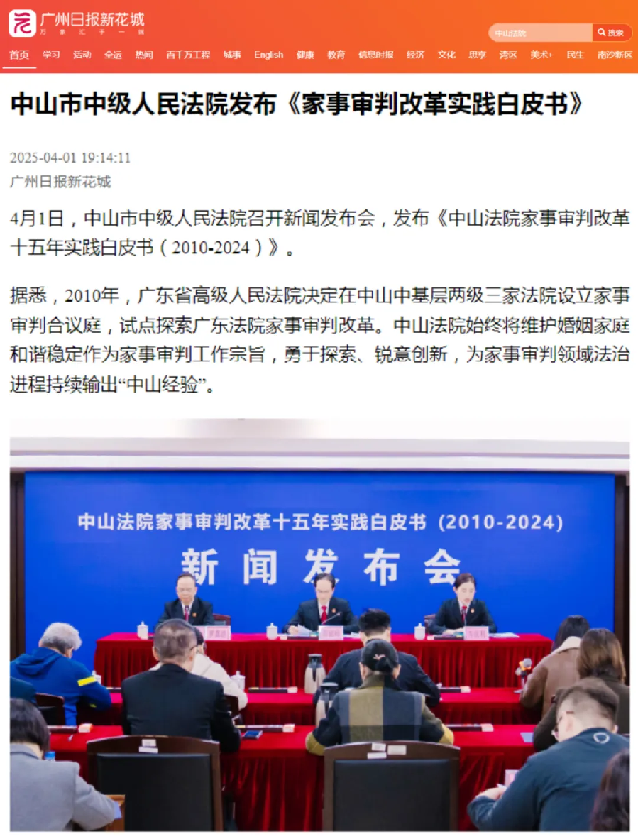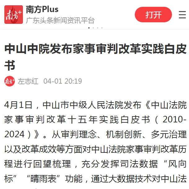 李宇玲: 白皮書(shū)很震撼,中山法院工作突出,為家事法官們點(diǎn)贊?;仡欉^(guò)去十五年,中山法院勇于探索、敢于創(chuàng)新,通過(guò)創(chuàng)新機(jī)構(gòu)設(shè)置、建立特色制度、加強(qiáng)部門(mén)聯(lián)動(dòng)等多重舉措,推動(dòng)家事審判改革取得顯著成效,為維護(hù)家庭穩(wěn)定、促進(jìn)社會(huì)和諧提供了中山智慧、中山經(jīng)驗(yàn)。 《南方日?qǐng)?bào)》等新聞媒體記者進(jìn)行了聚焦報(bào)道。 《南方》