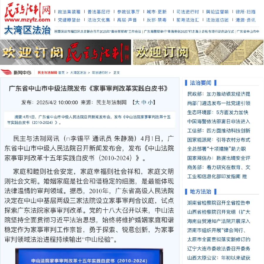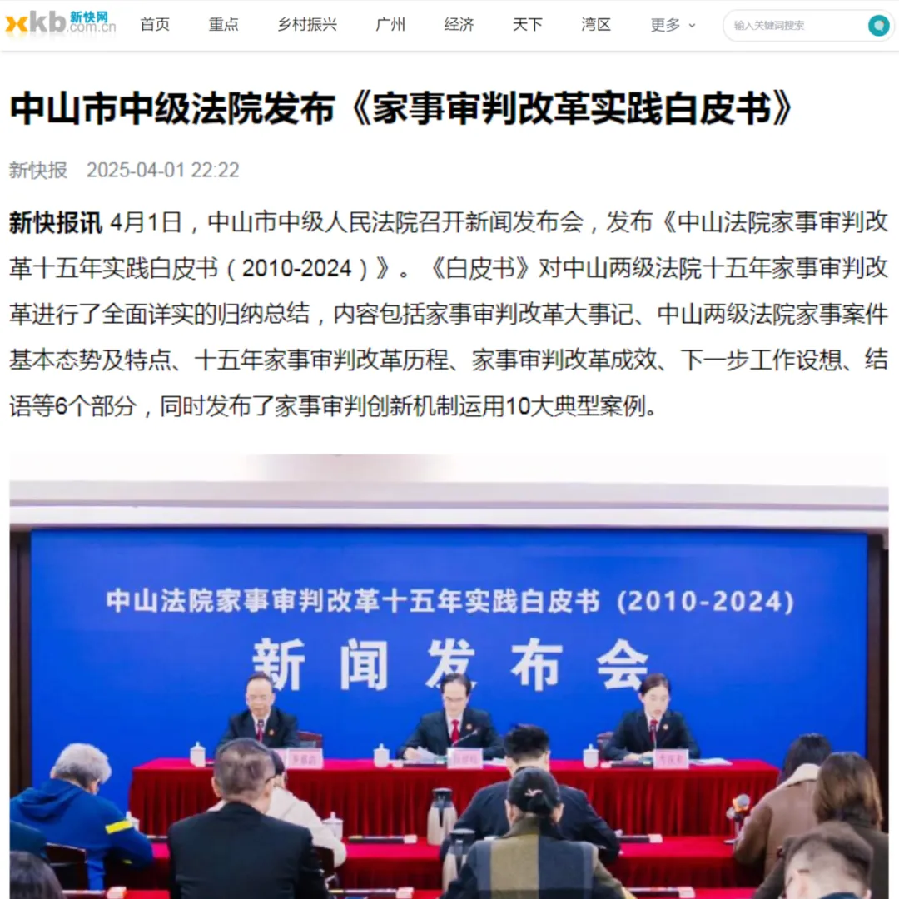 4月1日,中山市中級(jí)人民法院召開(kāi)新聞發(fā)布會(huì),發(fā)布《中山法院家事審判改革十五年實(shí)踐白皮書(shū)(2010-2024)》。 這份白皮書(shū)引起現(xiàn)場(chǎng)嘉賓的熱議,一起跟著鏡頭,聽(tīng)代表委員、媒體記者們的聲音…… 全國(guó)人大代表