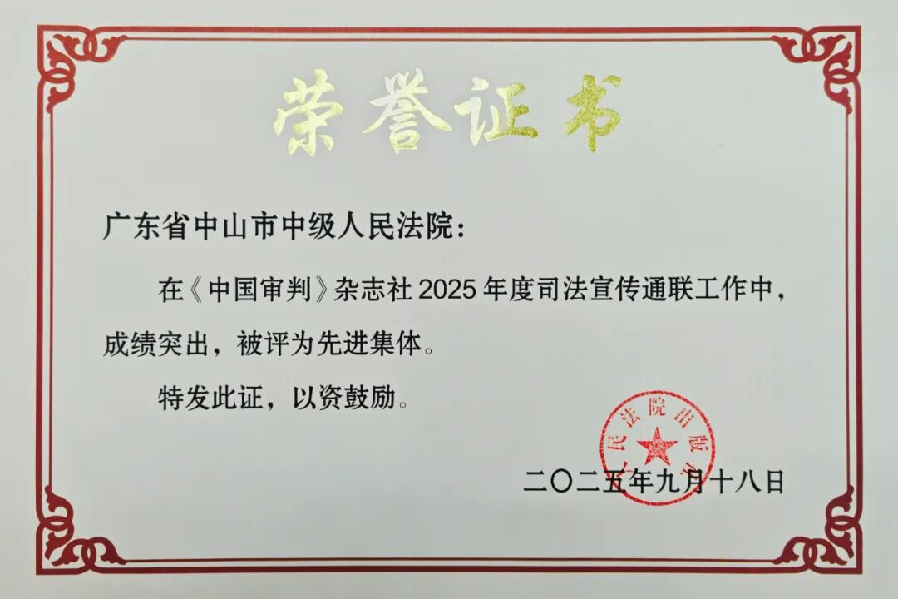 人民法院出版社發(fā)布《關(guān)于表彰中國審判雜志社2025年度司法宣傳工作先進集體先進個人的決定》,中山市中級人民法院憑借在司法宣傳工作中的突出表現(xiàn),獲評“2025年度司法宣傳工作先進集體”,這是該院連續(xù)第五年獲此殊榮。